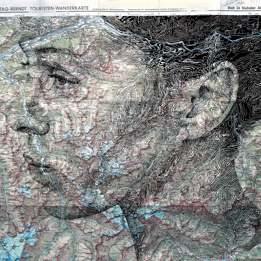 “Ed Fairburn is an English artist whose ability to combine the geography of our facial features with the geography of the earth leads to a startling and compelling synthesis of the two. Fairburn has become known in Europe for his evocative portraits, which produce complex human features from the apparently random patterns found in mundane topographical and astrological maps.