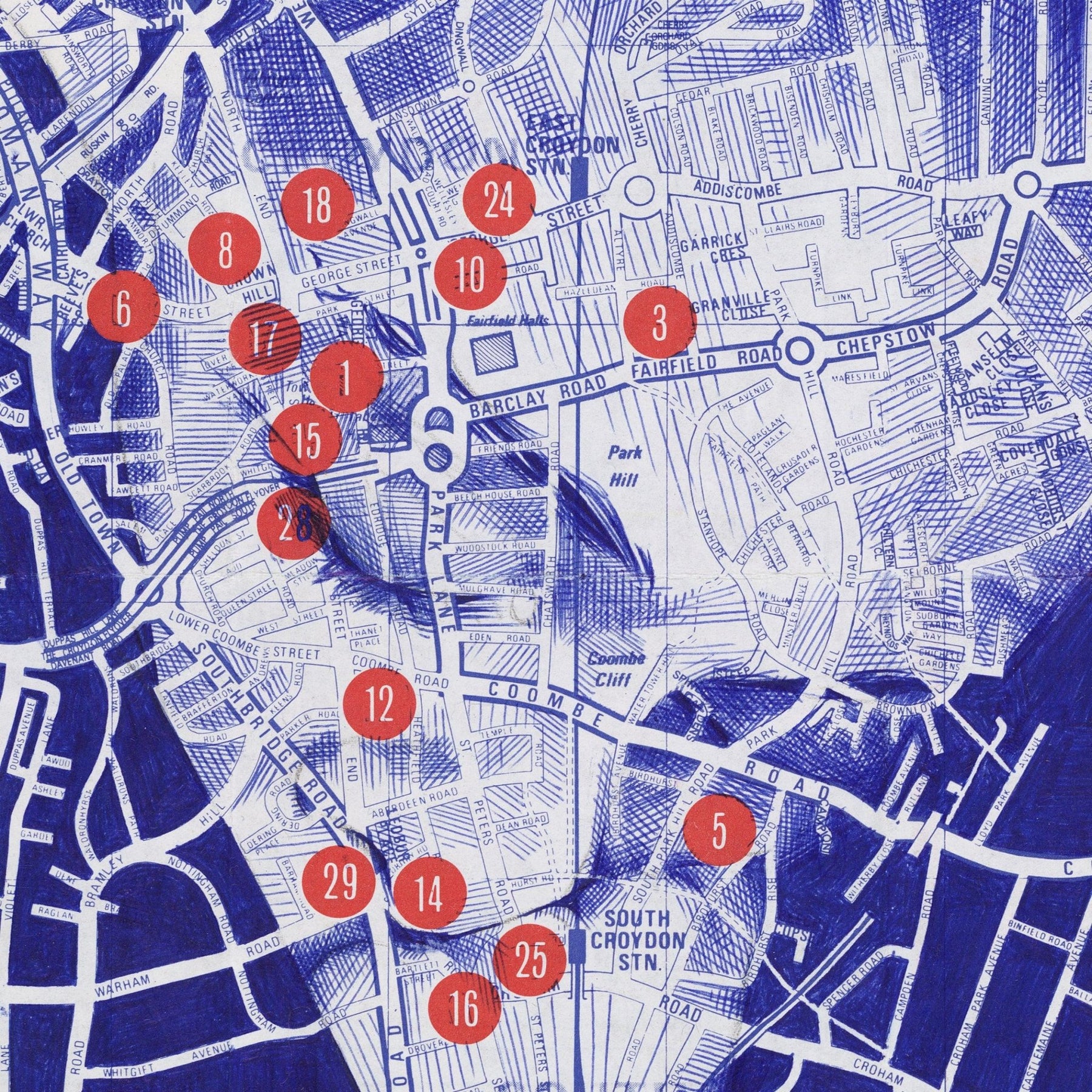 Ink on a miniature inset street map of Croydon, London. Released April 2014.