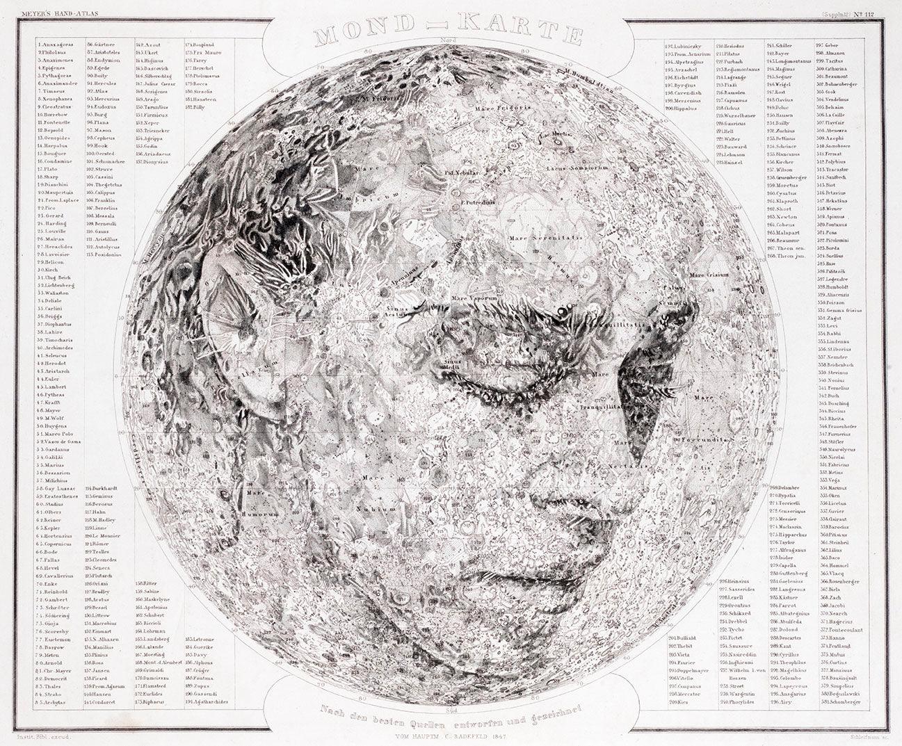 Pencil on a reproduced map of the Moon, featuring crater names and other features listed on either side. Released January 2013.